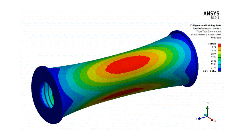 Buckling is one of the most important failure modes to consider in pressure vessel design as it can lead to a sudden and catastrophic collapse. The animation below shows the first buckling mode obtained from a linear elastic buckling analysis of a ring-stiffened cylindrical shell subject to external pressure. Overall collapse of the structure is predicted principally because of the short shell bay length and slender stiffeners used.
