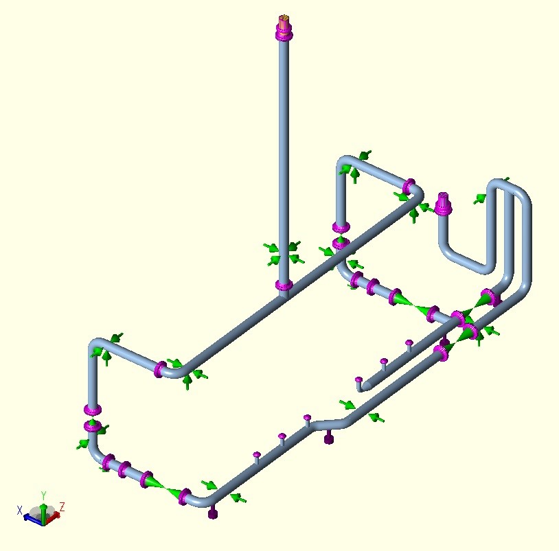 The primary objective of the work was to determine restraint type and location to adequately support the pipework. However, a combination of very low allowable nozzle loads for the pumps employed on the skid and a number of complex loading scenarios (including blast loads and combinations of wind and accelerations due to FPSO motions) meant that from the outset the piping presented some interesting challenges. Additionally, due to the lack of available space within the skid and the constrained nature of the piping, the nozzle loads were extremely sensitive to restraint type and location adding an extra layer of complexity.